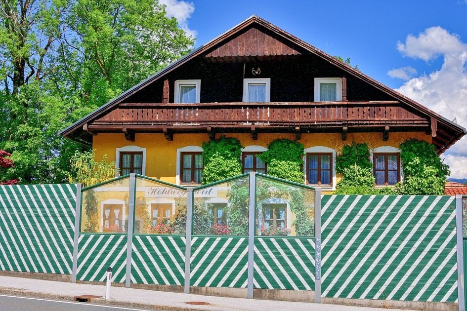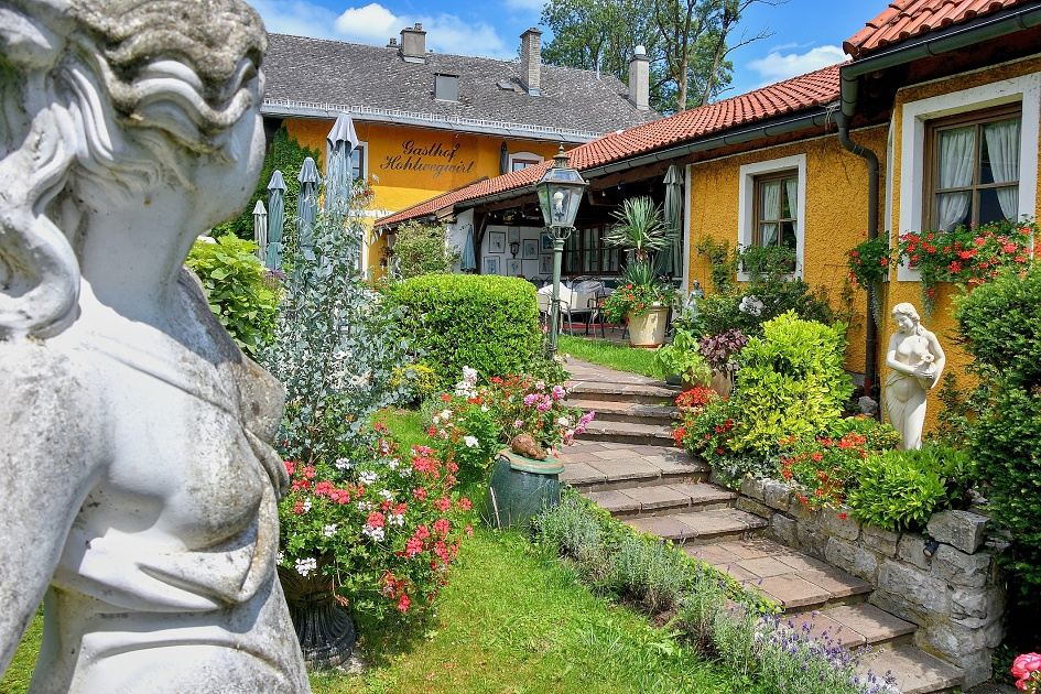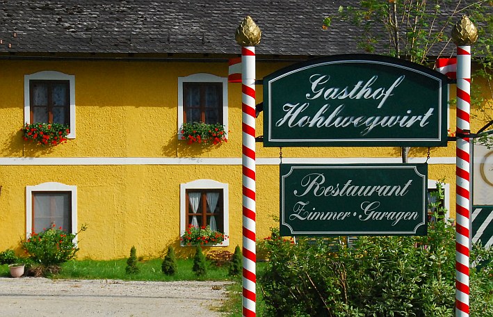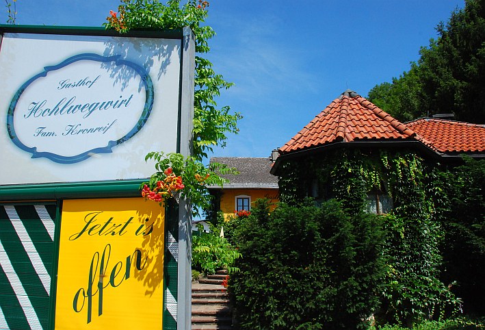 Der Gasthof Hohlwegwirt liegt abgeschirmt durch eine Lärmschutzwand von der Bundesstraße in einem gepflegten Garten. Von der Terrasse blickt man auf Ruine Gutrat und auf zwei markante Felsen, die Barmsteine, im Dialekt "Boamstoana" genannt. Zu ihren Füssen liegt die Hofbrauerei Kaltenhausen. Imposant erhebt sich der Untersberg, der Hausberg der Salzburger, auf den eine Seilbahn führt.